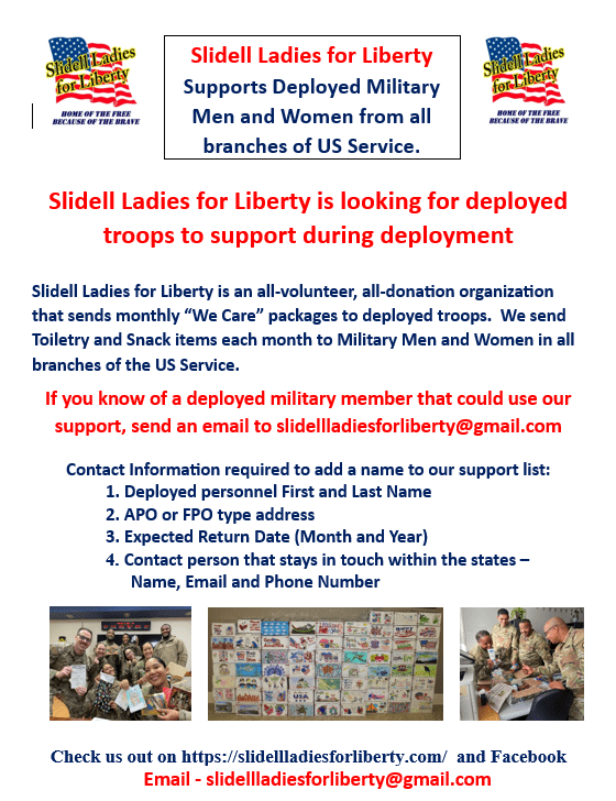 Add a Name to our Support List Submit your Military friend or family member’s name using the form below: Go backYour message has been sent Deployed First Name(required) Warning Deployed Last Name(required) Warning Deployed Address 1st Line(required) Warning Deployed Address 2nd Line if needed Warning APO or FPO Address Line (required) Warning Expected Return Date (Month and Year) (required) Warning We send special female boxes if requested Male or Female Warning Your contact information is needed Your Name(required) Warning Your Email(required) Warning Your Phone Number(required) Warning Additional Information or Comments Warning When your request is processed and the name added you will receive a confirmation email. Warning. Submit Name Submitting form Δ Share this: Click to share on Facebook (Opens in new window) Facebook Click to email a link to a friend (Opens in new window) Email Click to share on X (Opens in new window) X